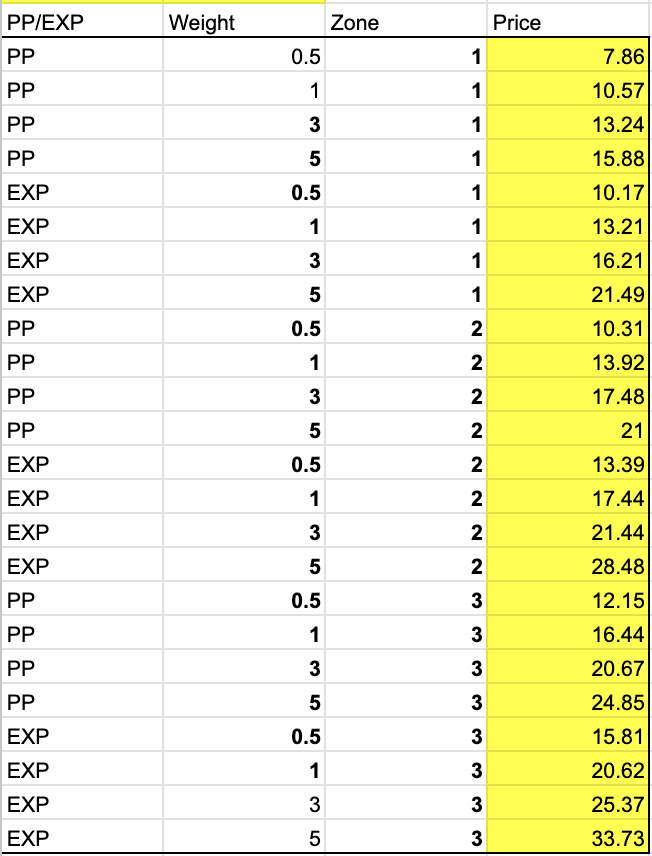 For local delivery, use the chart below(contact us if you need clear version):